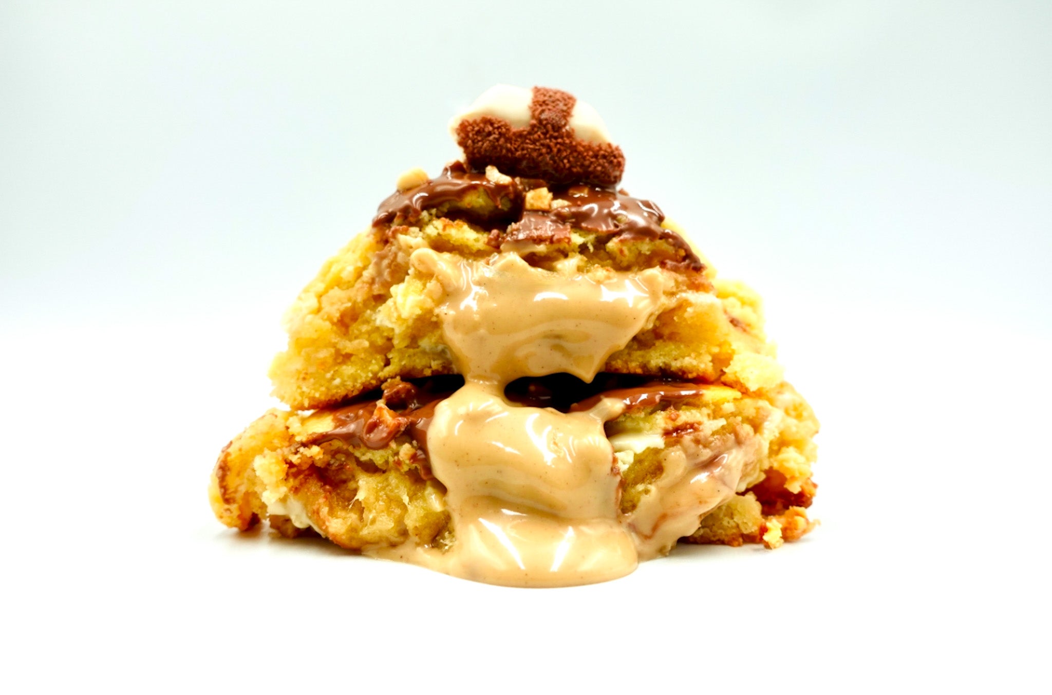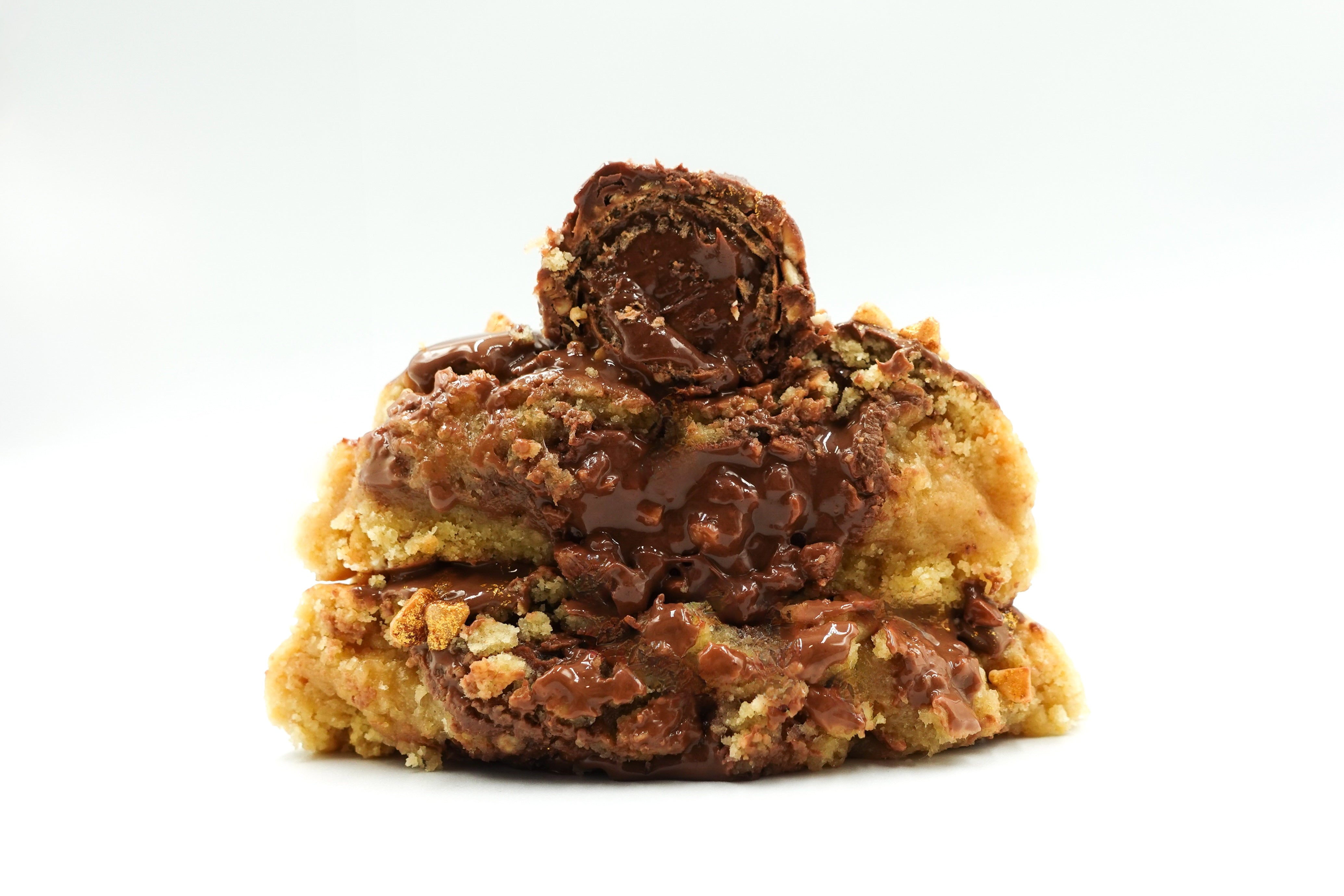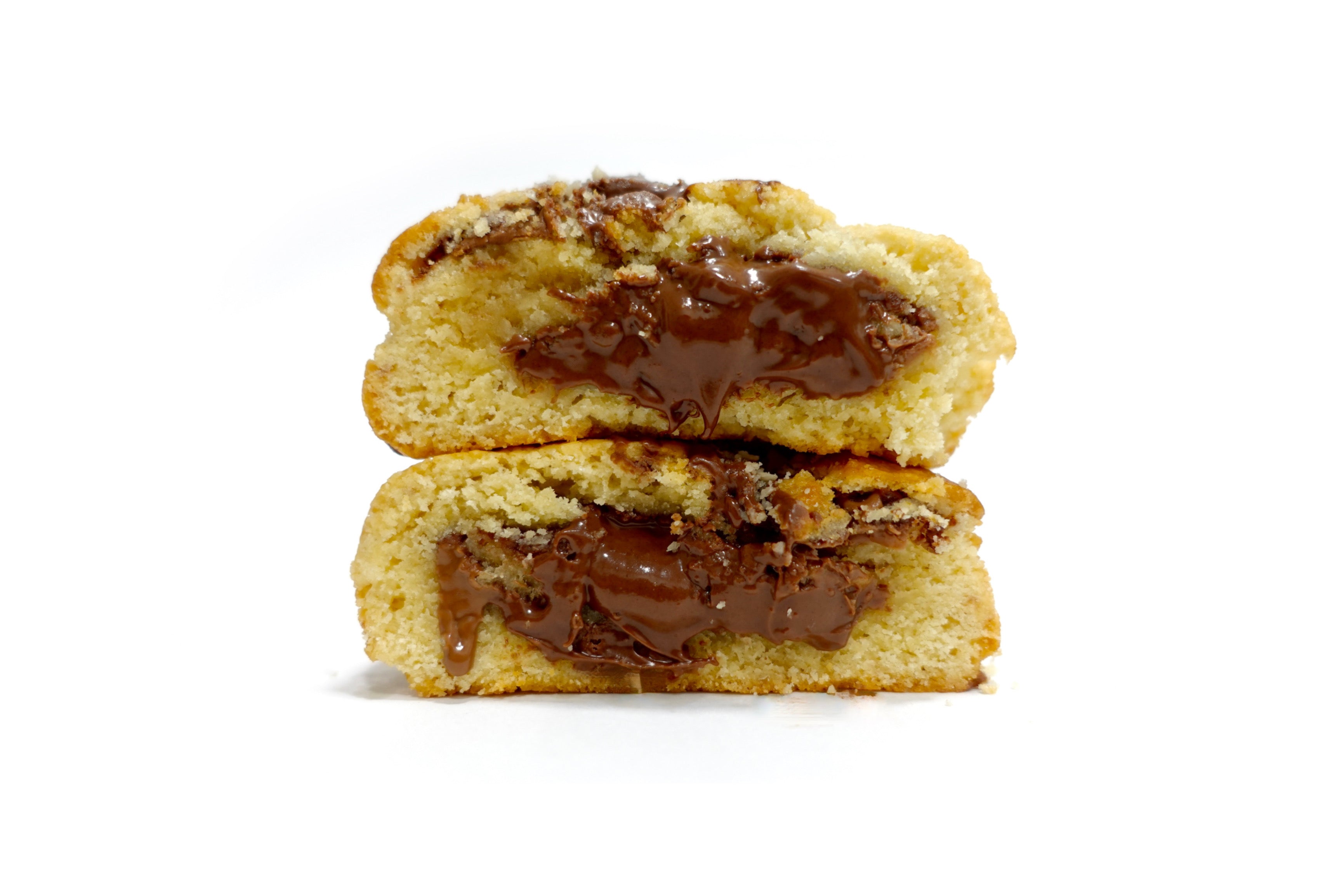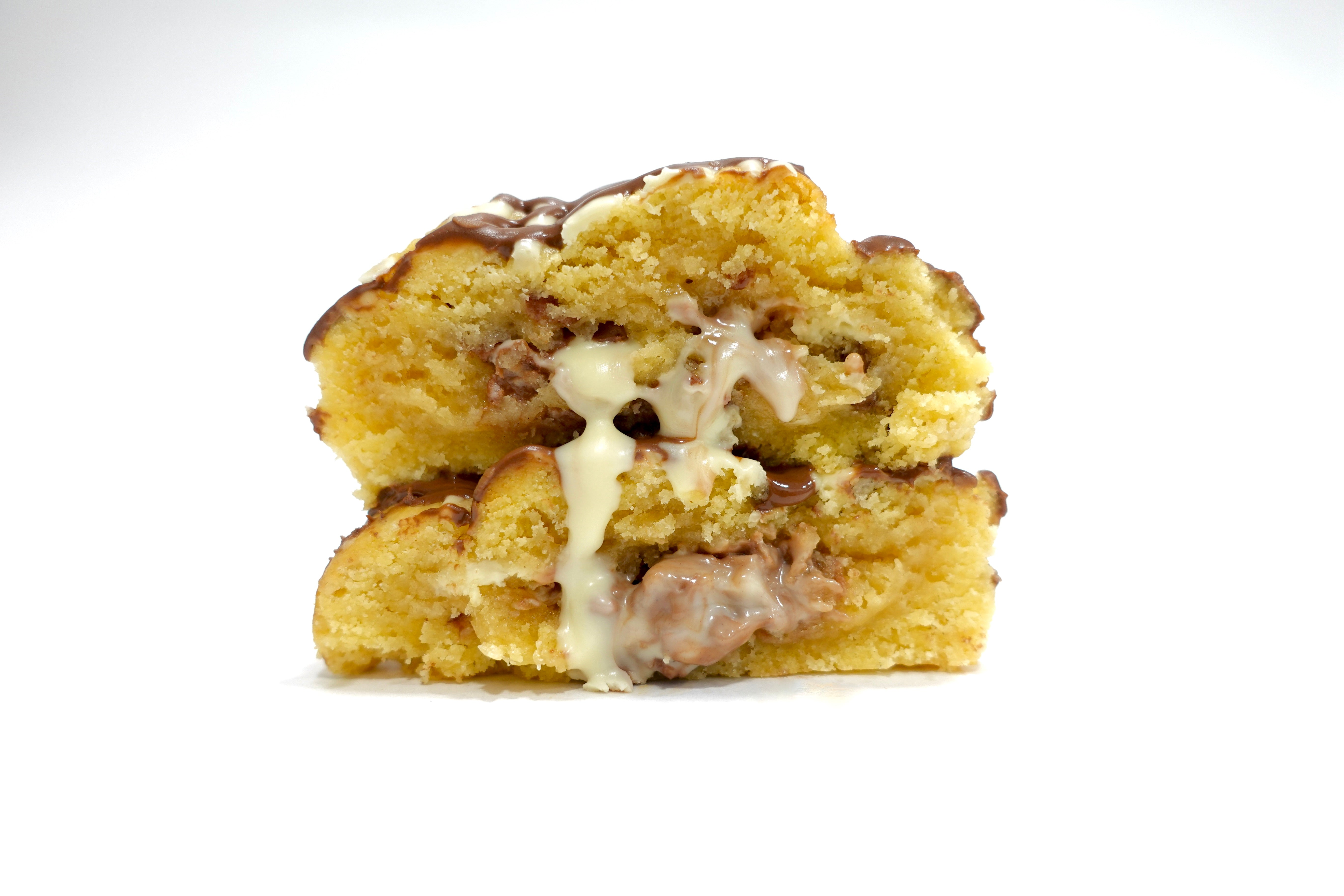 Ce cookie est garni puis décoré d'un filet de chocolat au lait, de poudre de noisette et est généreusement fourré au Nutella.