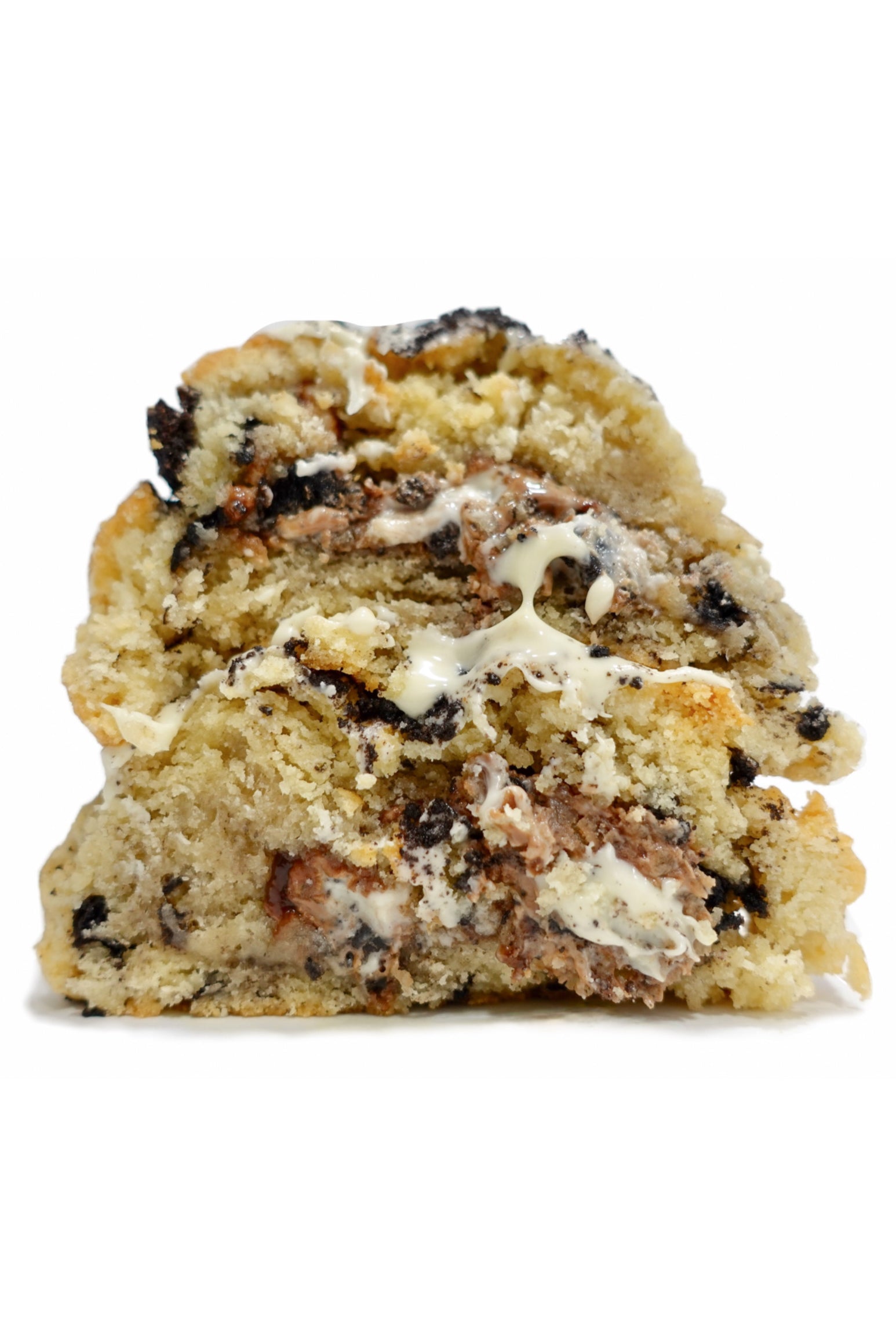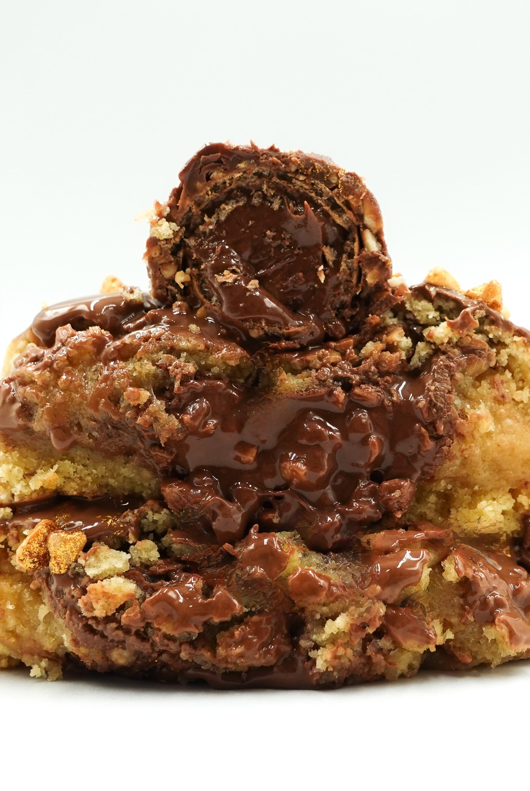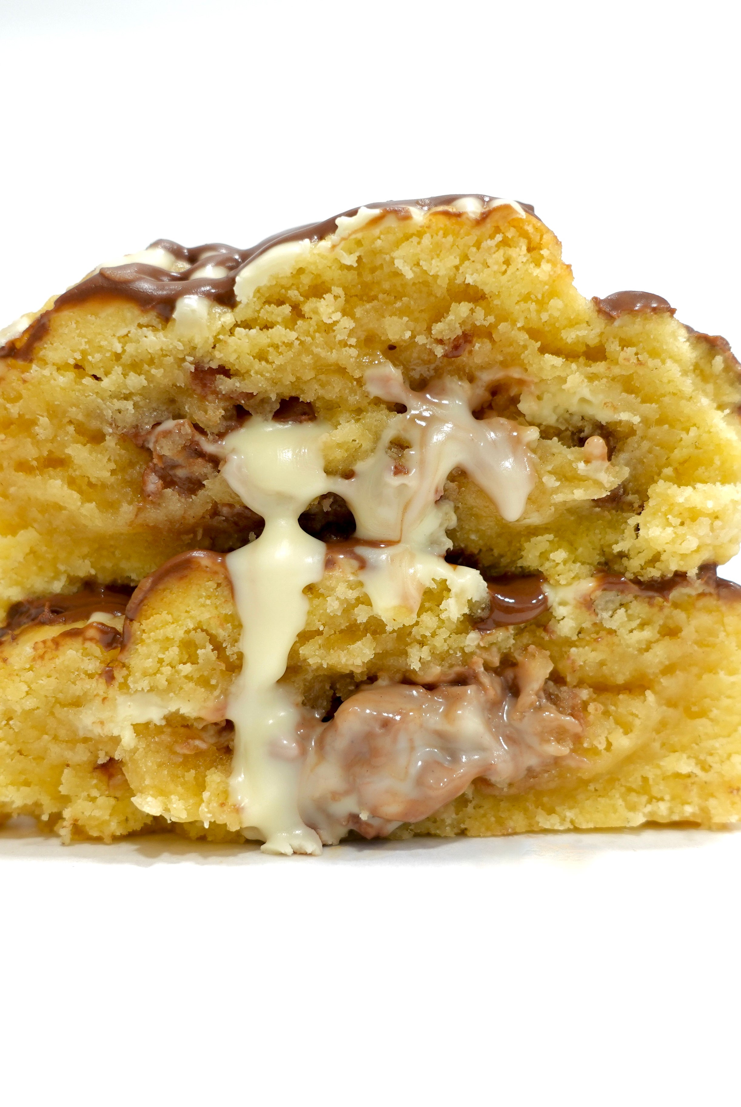 Ce cookie est garni puis décoré d'un filet de chocolat au lait, de poudre de noisette et est généreusement fourré au Nutella.
