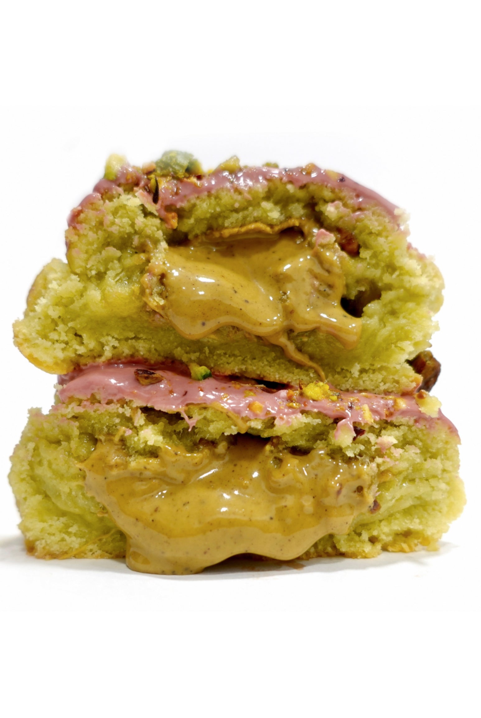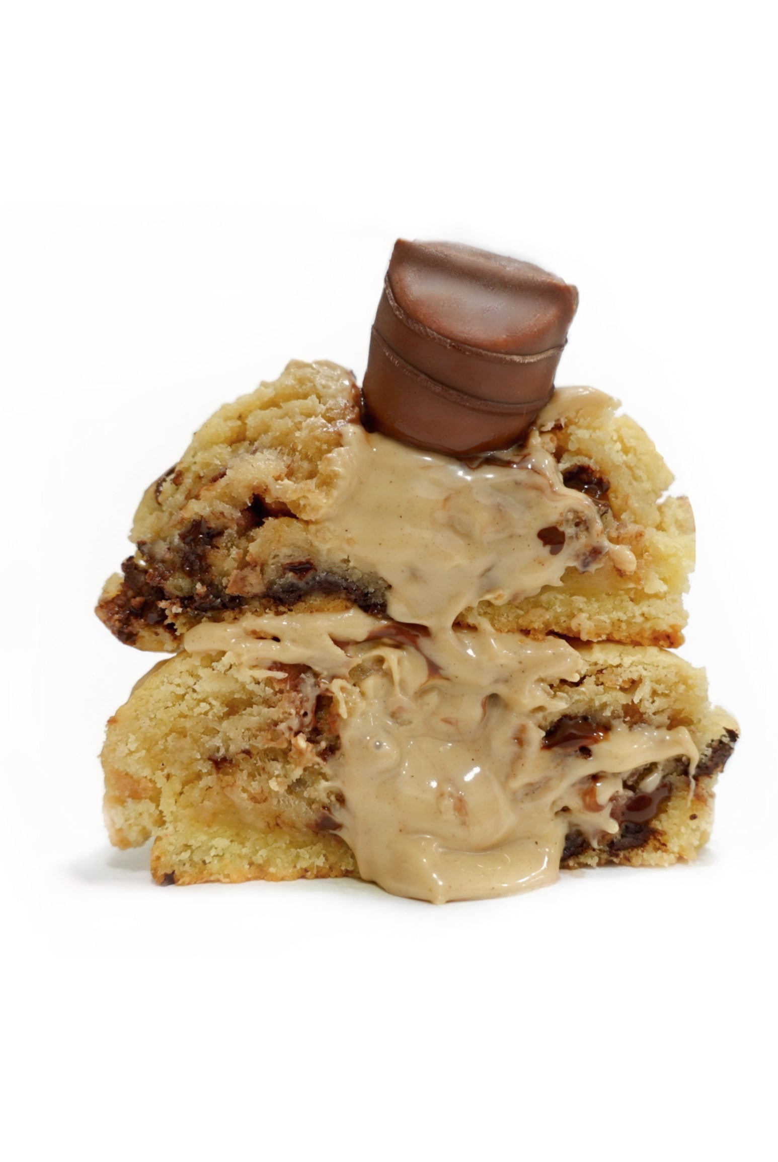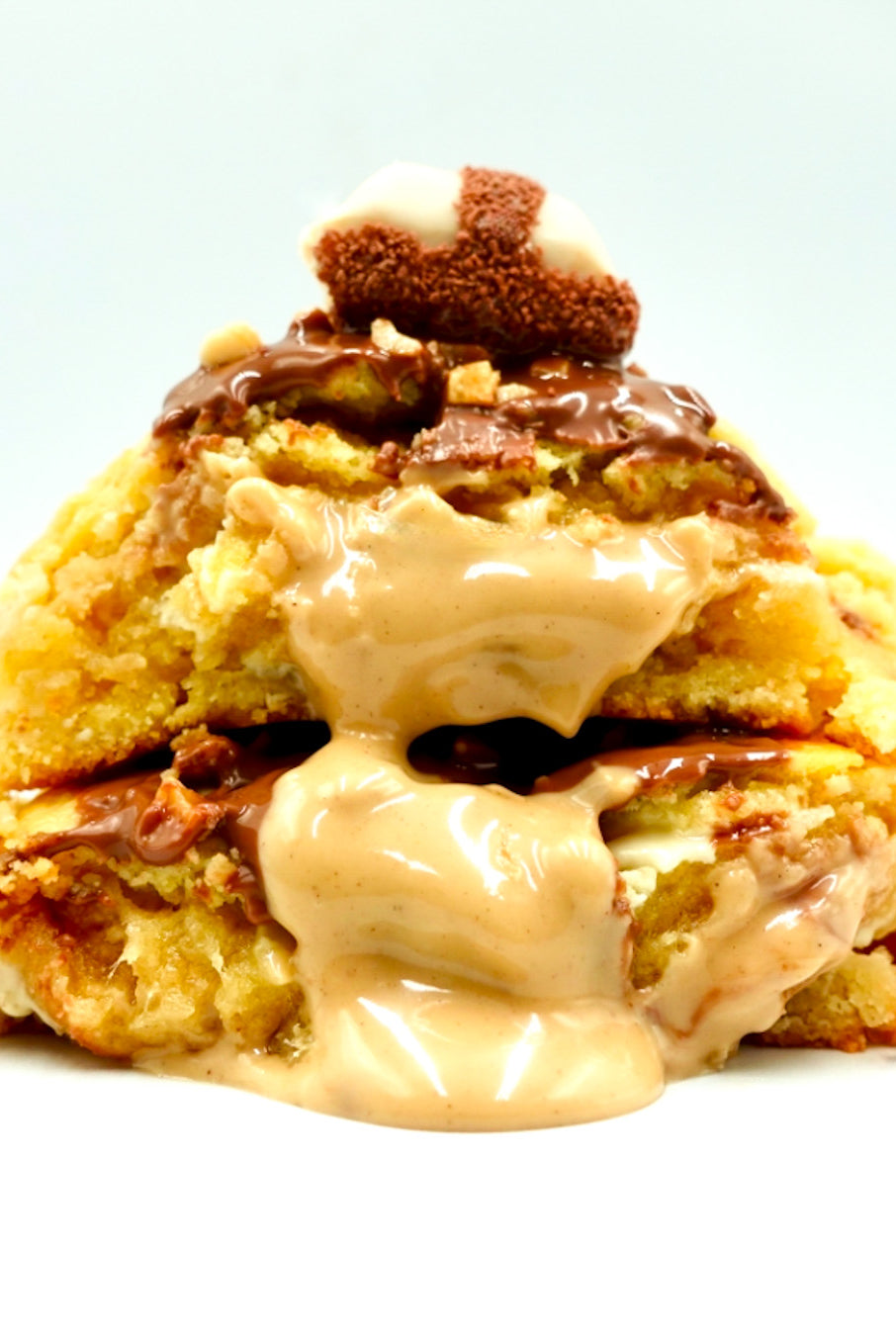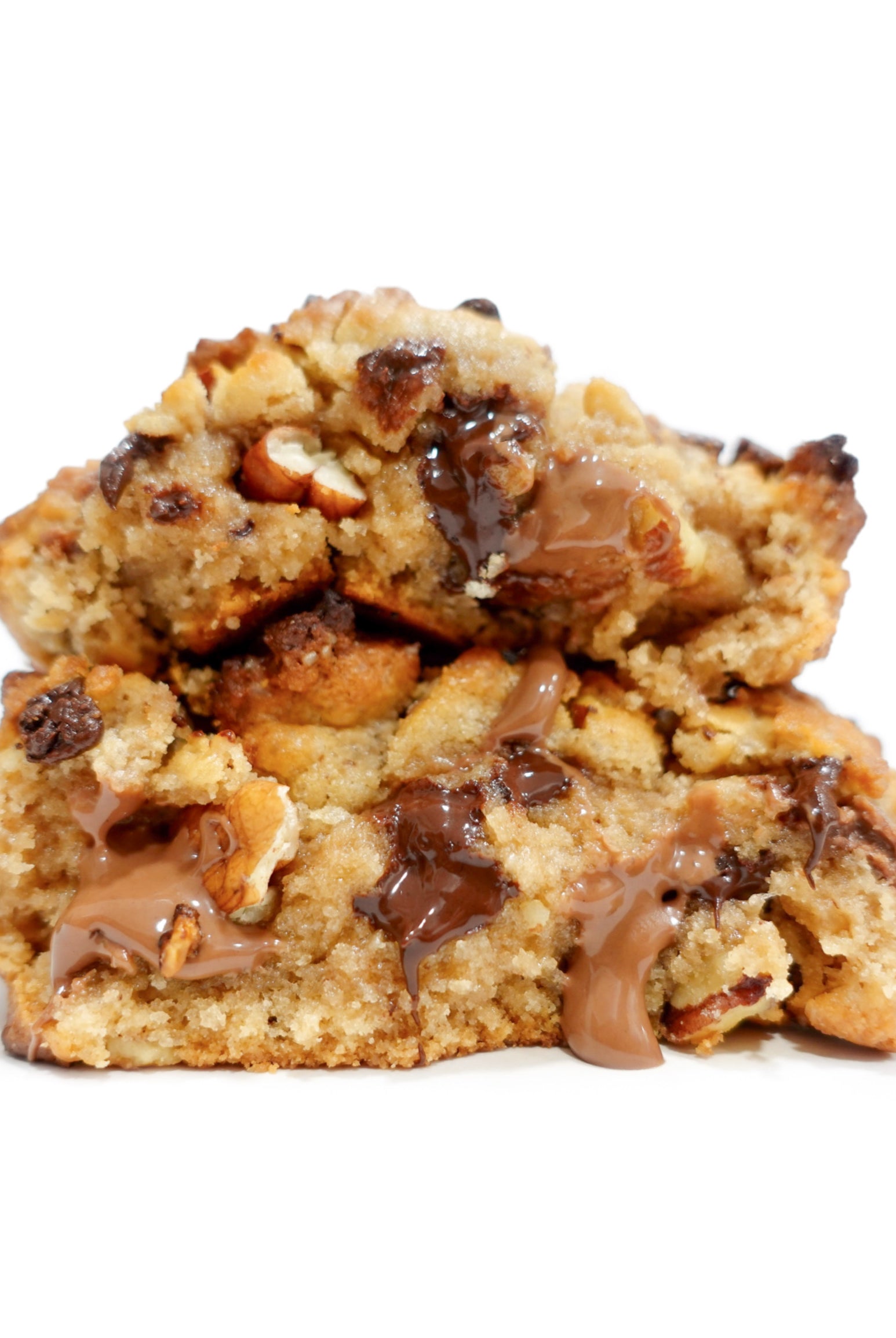 Ce cookie est garni puis décoré d'un filet de chocolat au lait, de poudre de noisette et est généreusement fourré au Nutella.